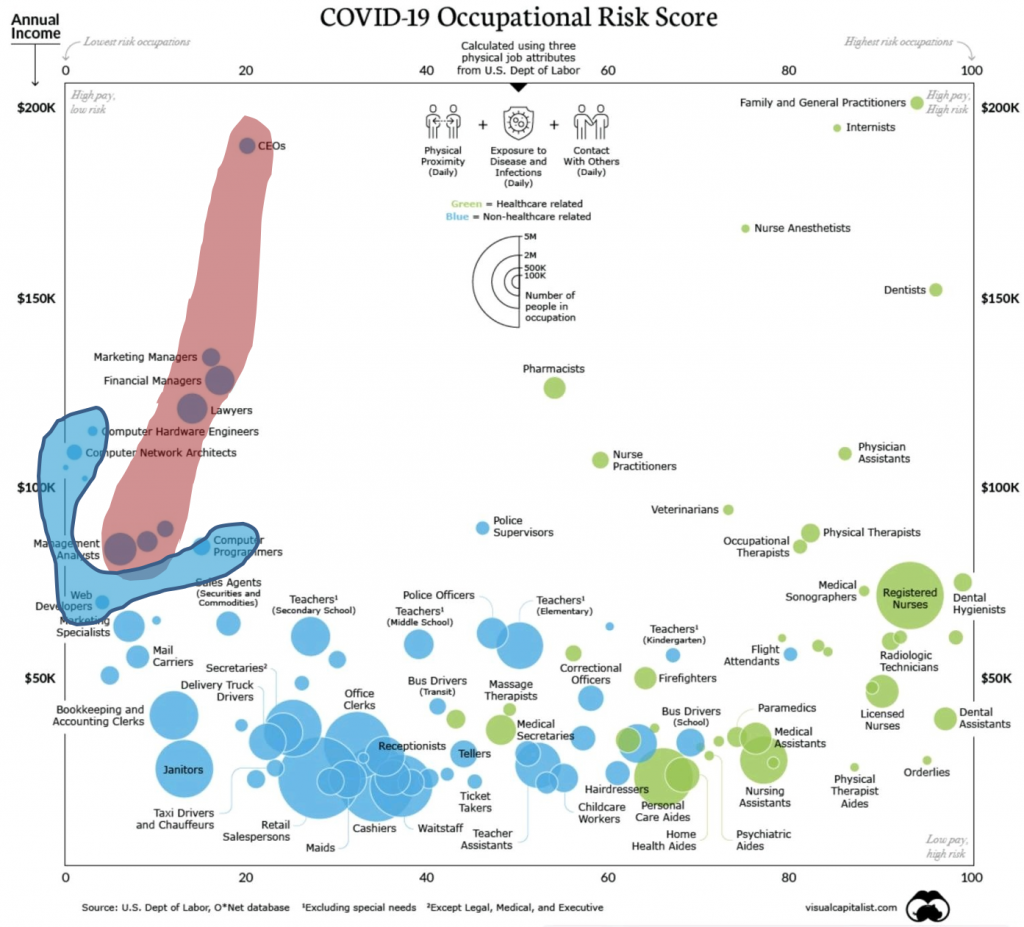 Según un reciente estudio a partir de los datos oficiales de ocupación de EEUU, realizado por Visual Capitalist (sitio especializado en elaborar contenidos visuales para inversores y profesionales de negocios para hacer más comprensibles los datos), tanto los profesionales con funciones de dirección y gestión como los dedicados a actividades TIC (tecnologías de la información y las telecomunicaciones) son los que menos riesgo asumen en la actual crisis de la COVID-19.