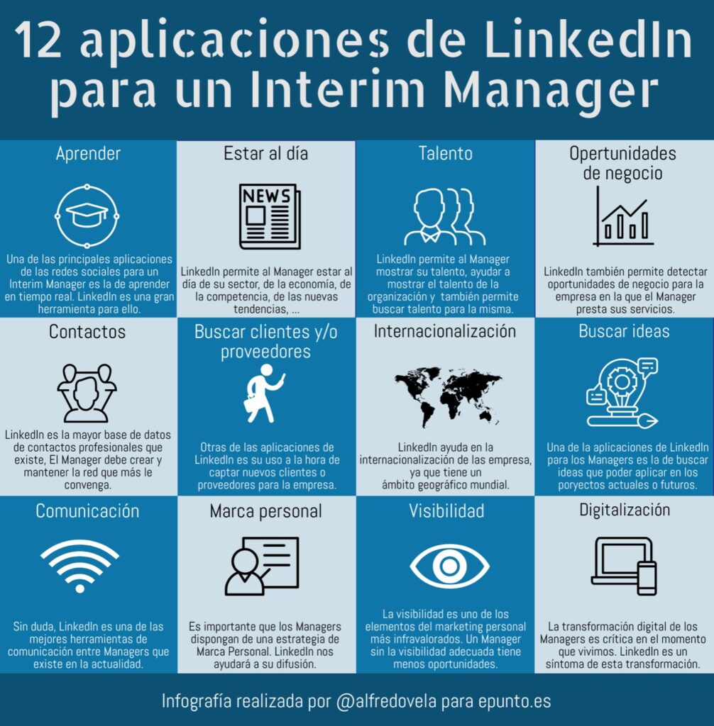 12 aplicaciones de LinkedIn para un Interim Manager Las 12 aplicaciones siguientes, orientadas a las necesidades y actividades más habituales para los interim managers, serán reforzadas en los Talleres de